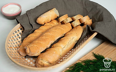 Дайте багетам полностью остыть, нарежьте на кусочки или разломайте произвольно руками, подайте к столу.
