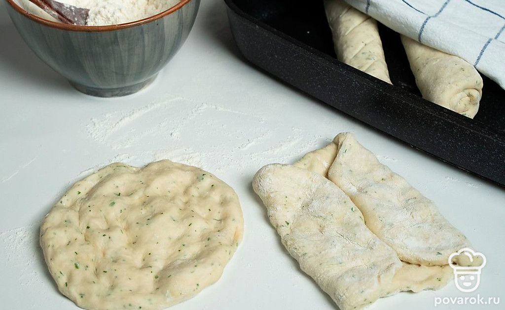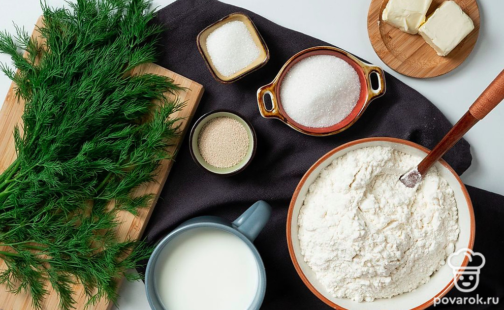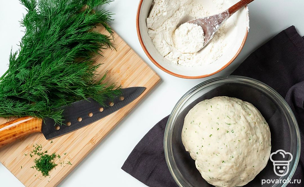 Сделайте тесто. Разведите дрожжи в теплой воде с сахаром, влейте молоко, растопленное масло, всыпьте муку, укроп. Дайте постоять в тепле под полотенцем 1,5 часа. Далее тесто разомните и оставьте еще на час.