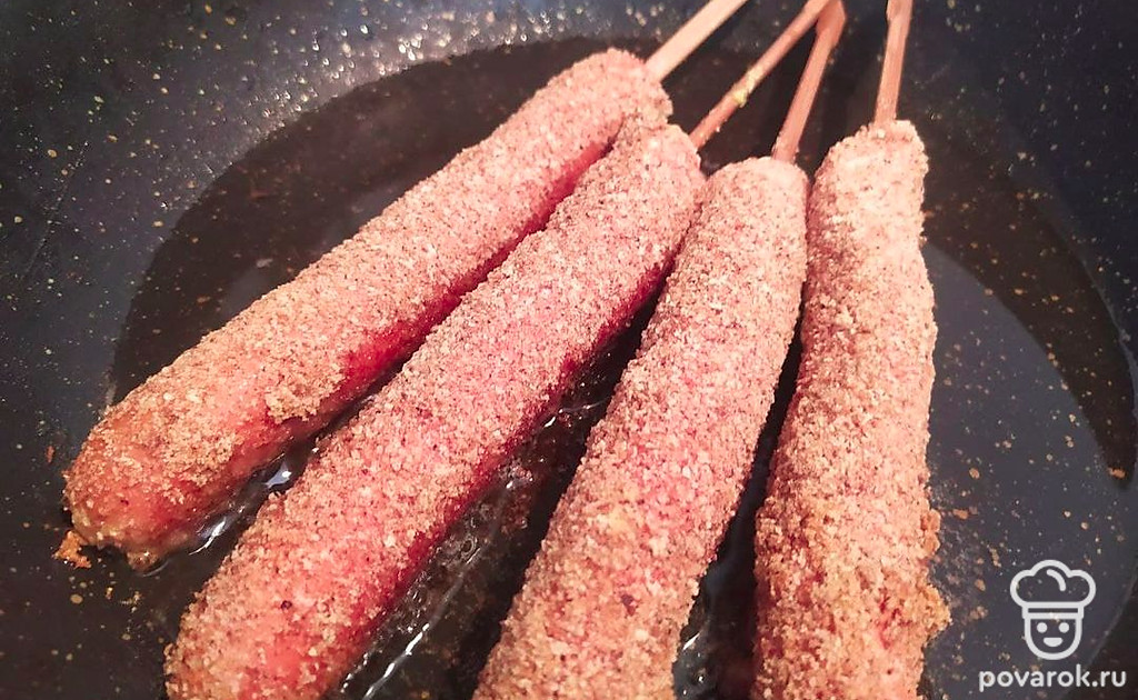 После этого тщательно обваляйте сосиски в панировочных сухарях, чтоб была плотная оболочка. Разогрейте растительное масло и жарьте хот доги около 4 минут, постоянно переворачивая.