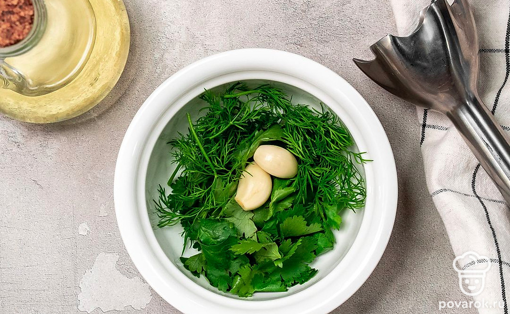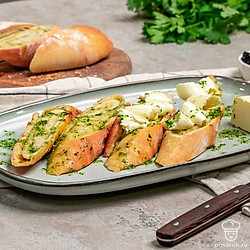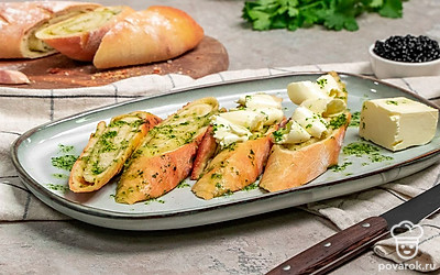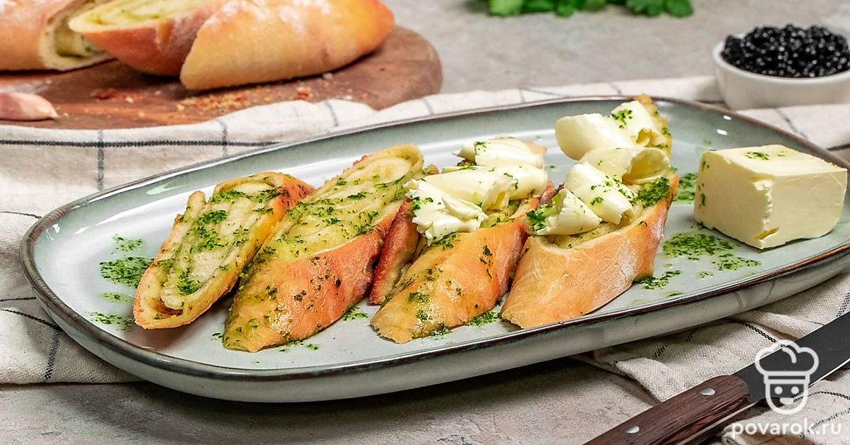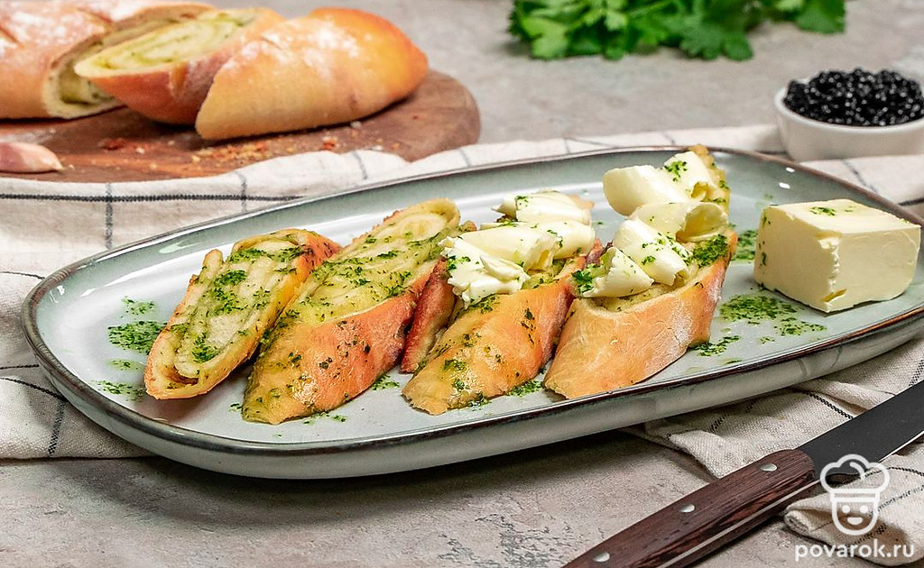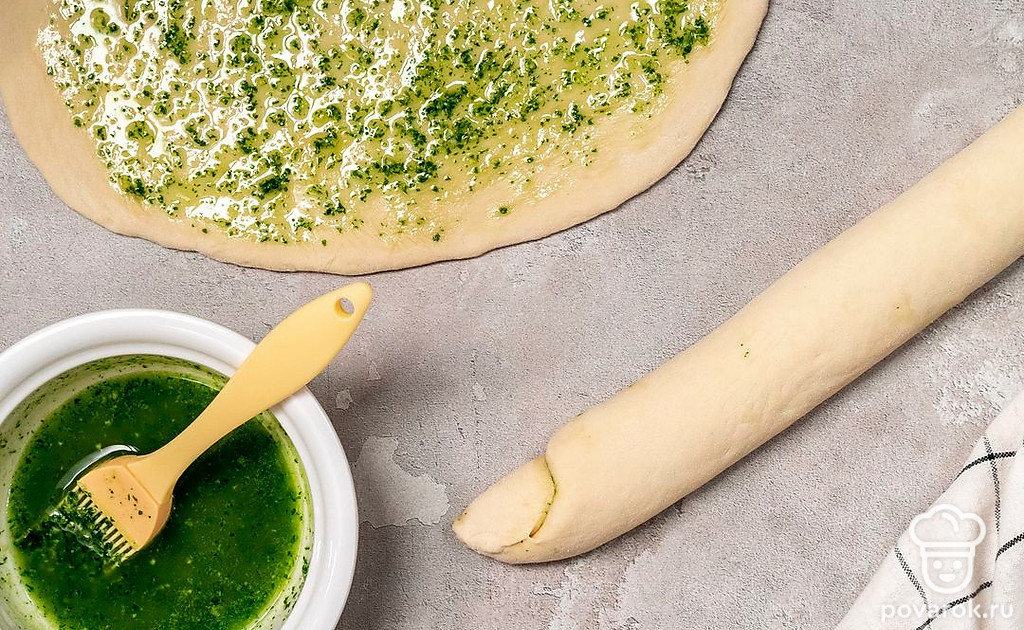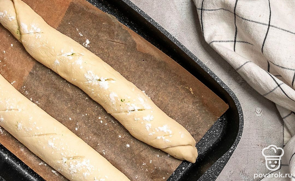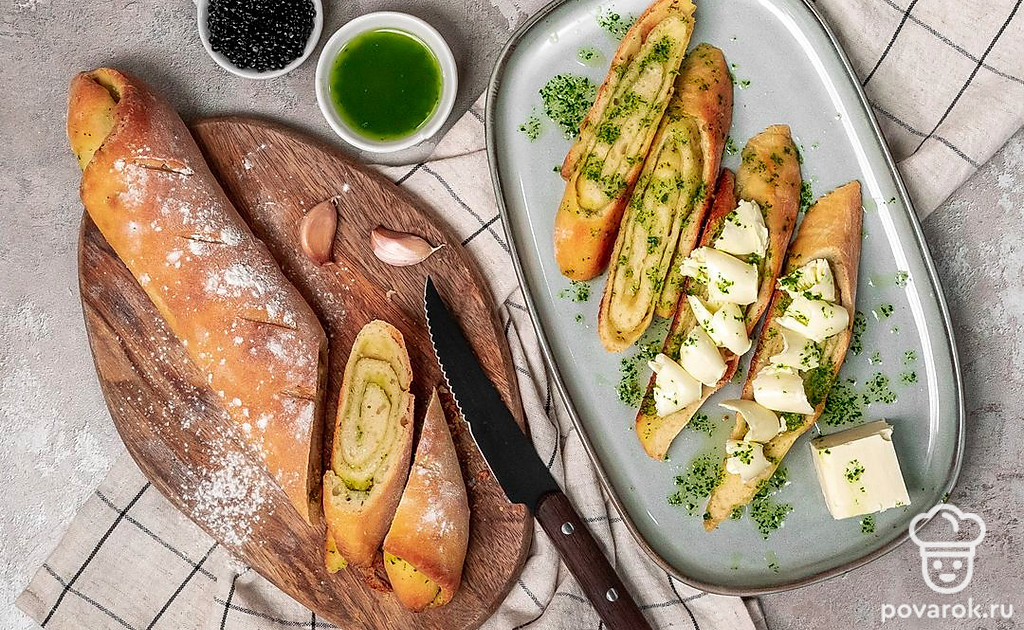 Багет со свежей зеленью выпекают из дрожжевого теста с добавлением пикантной ароматной начинки. Пропущенный через пресс чеснок смешивают с маслом и измельченной зеленью. Начинку закладывают в надрезы или наносят слоем на тонко раскатанное тесто и закручивают рулетом. Пряная начинка из чеснока и зелени оттеняет воздушное тесто, а хрустящая сырная корочка дает сытость на долгое время. Начинку можно сделать на основе любых трав и специй.