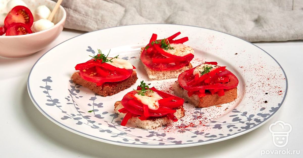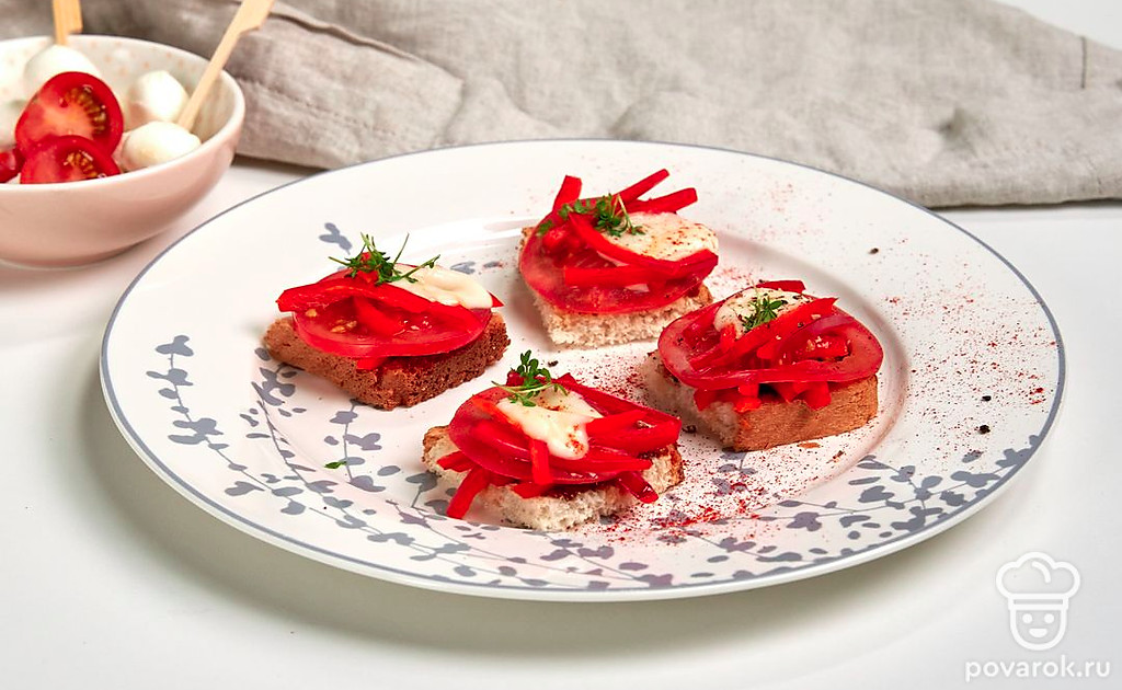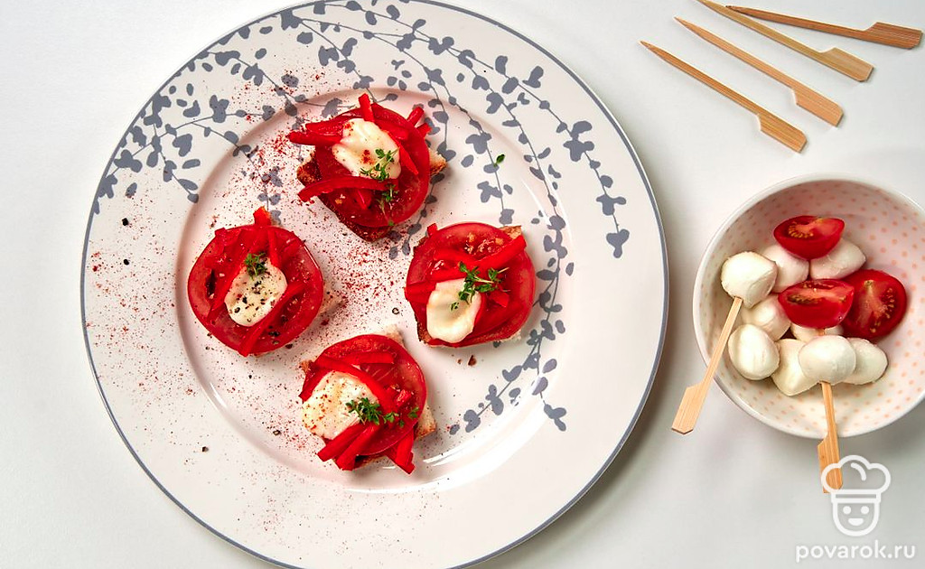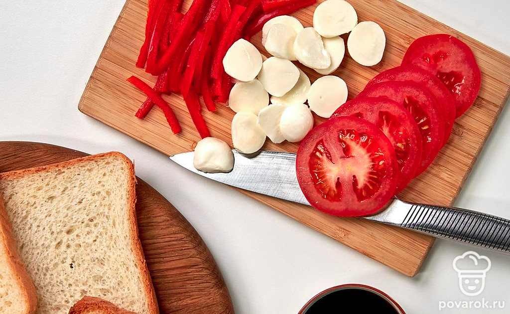 Подготовьте продукты для тостов. Помидоры нарежьте кружочками, болгарский перец — полосками, моцареллу — половинками.