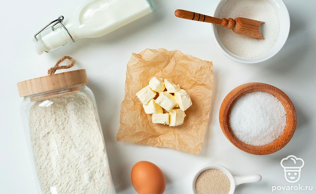 Замесите тесто. В миску выложите муку, дрожжи, сахар и соль, перемешайте. Туда же влейте теплое молоко со сливочным маслом. Перемешивайте массу около 10 минут, пока не получится однородное тесто. Затем накройте его пищевой пленкой или полотенцем, оставьте в теплом месте на 2-3 часа.