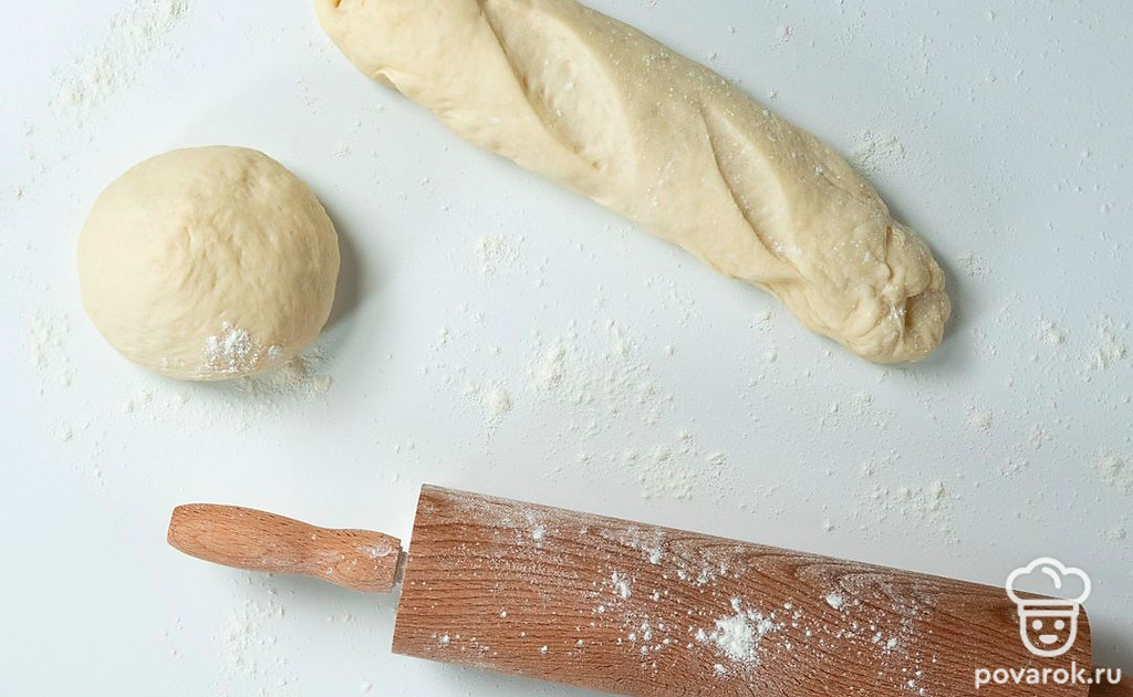 Сформируйте багет. Готовое тесто снова разомните руками, после чего разделите его на две равные части. Каждый кусок теста раскатайте в пласт толщиной не более 1 см. Затем сверните его в трубочку и положите швом вниз на противень, застеленный пергаментной бумагой. Сделайте небольшие надрезы по поверхности теста и оставьте его на 30 минут в теплом месте.