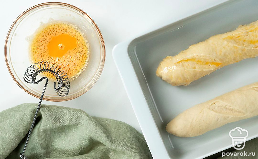 Поставьте багет запекаться. Яйцо взбейте, после чего смажьте им всю поверхность будущего багета, чтобы на нем образовалась румяная корочка. Противень поставьте в духовку на 20-25 минут при температуре 180 градусов.