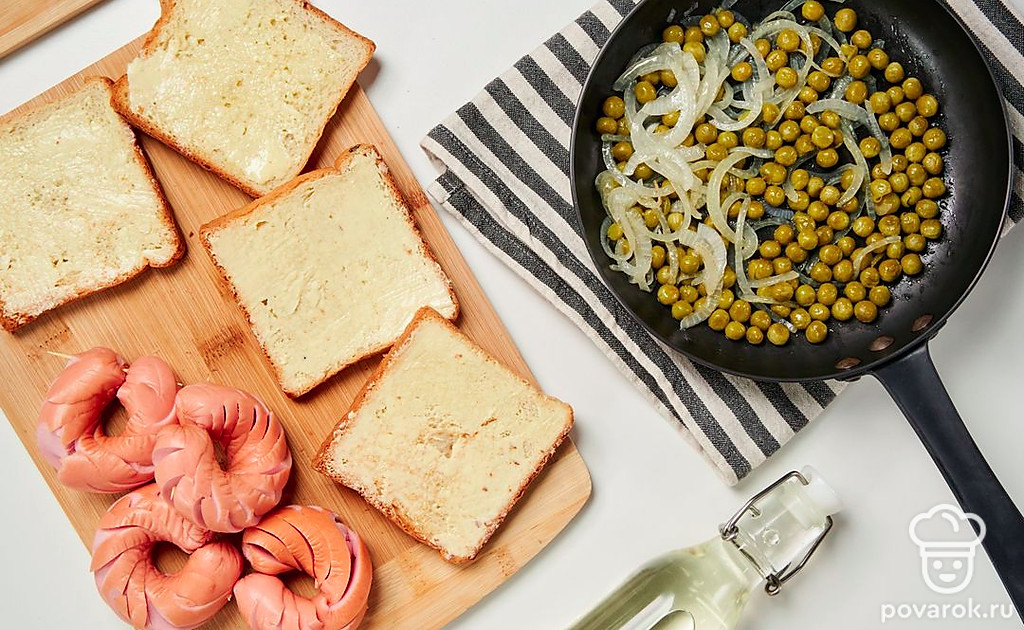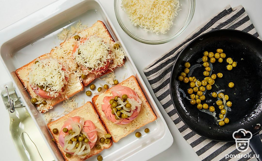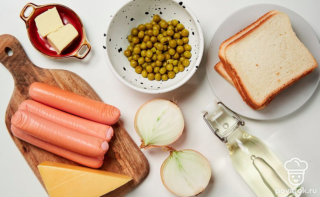 Тост с сосисками — доступное блюдо для быстрого завтрака и перекуса. Чтобы бутерброд получился более полезным, добавьте в состав начинки консервированный зеленый горошек. Это отличное средство для поднятия уровня гемоглобина и лечения анемии. Качественные сосиски должны быть упругими, при нажатии быстро возвращаться в первоначальную форму. Ярко-розовый цвет говорит о присутствии нитритов или красителей, от такого продукта лучше отказаться. Настоящий фарш должен быть серовато-розовым.