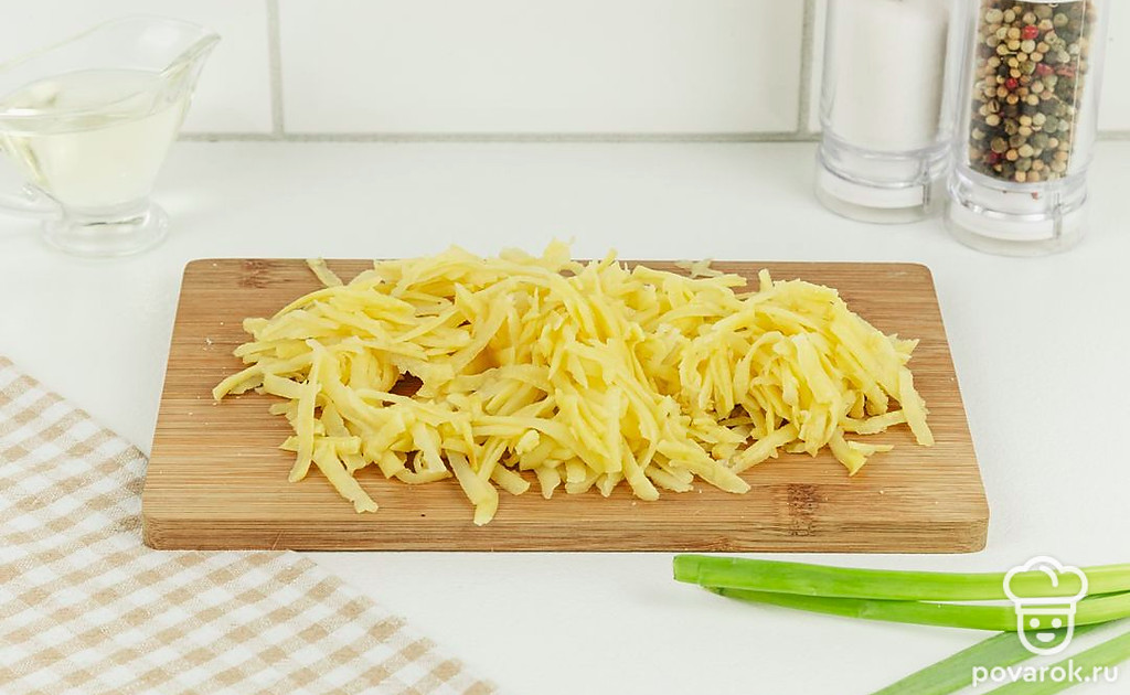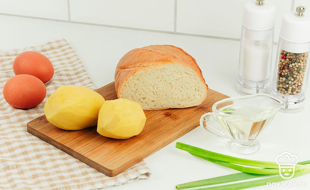 Проверьте все необходимые ингредиенты, подготовьте рабочую поверхность, очистите картофель, помойте куриные яйца и зелень.