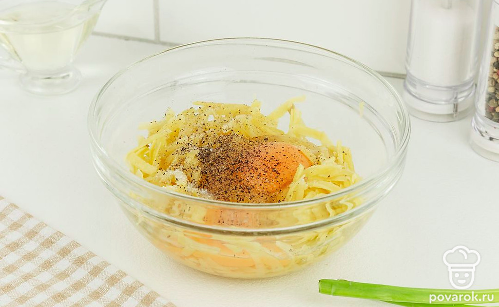 Смешайте в глубокой миске картофель, яйцо, соль и перец по вкусу.