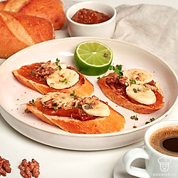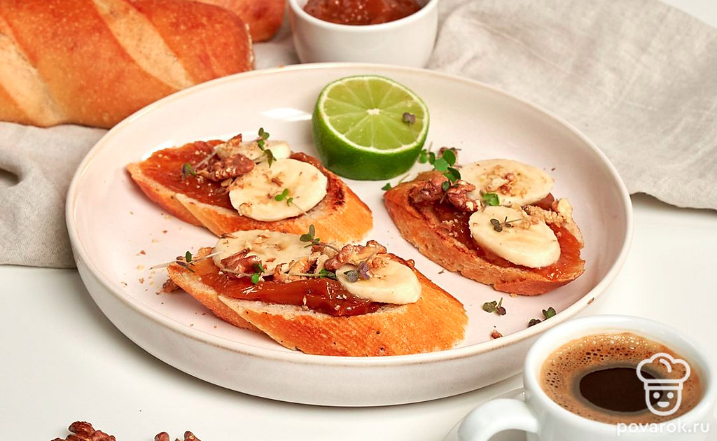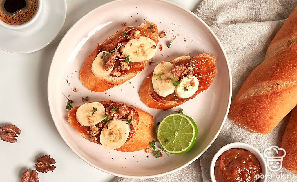 Подавайте багет с вареным сгущенным молоком, посыпав его крошкой грецкого ореха.