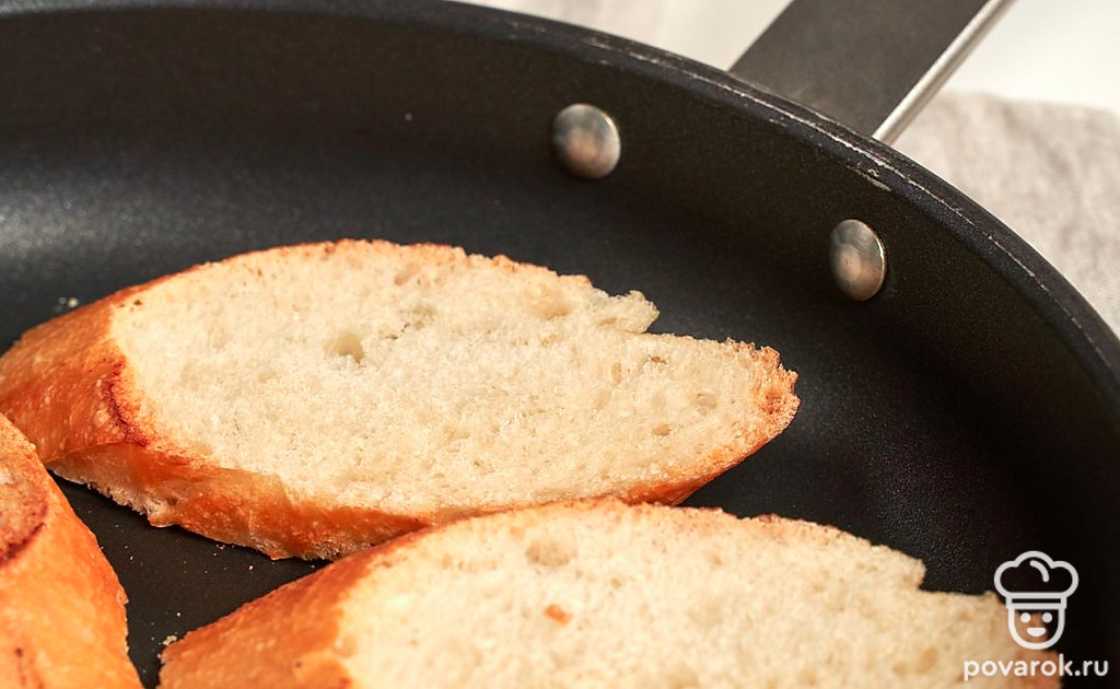 Поджарьте багет. На сковороде растопите сливочное масло. Багет порежьте наискосок на куски толщиной 1 см. Поджарьте багет на среднем огне по 2 минуты с каждой стороны.