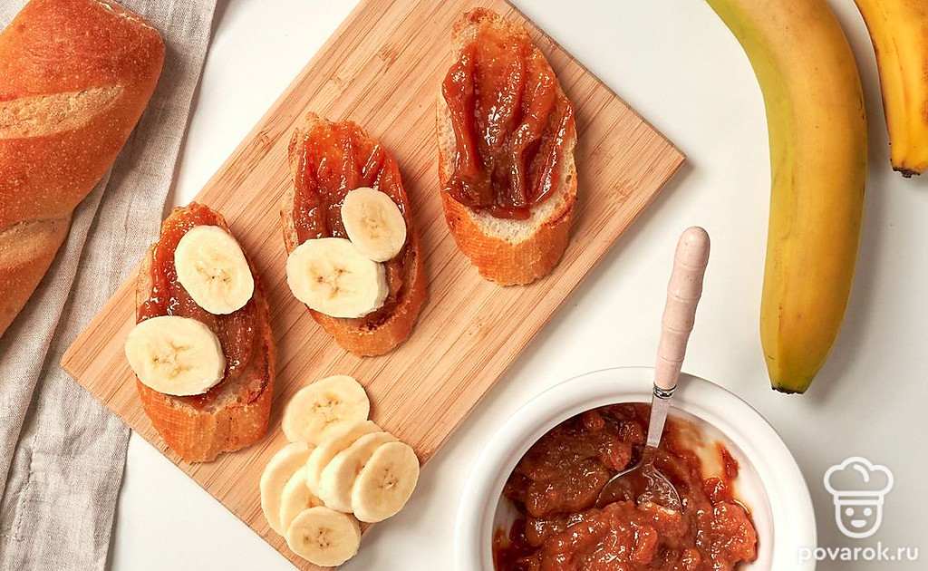 Приготовьте багет с вареным сгущенным молоком. Банан порежьте тонкими кружочками. Каждый кусок багета намажьте слоем вареной сгущенки. Сверху красиво выложите кусочки банана.