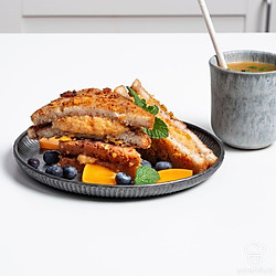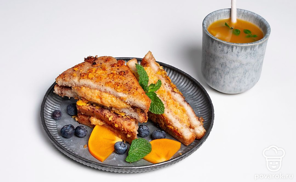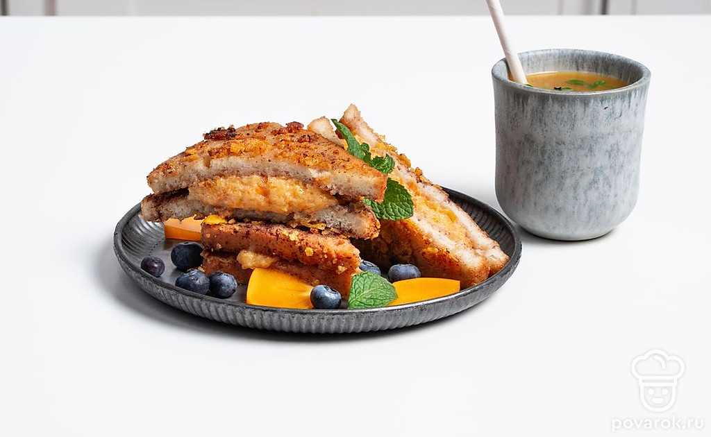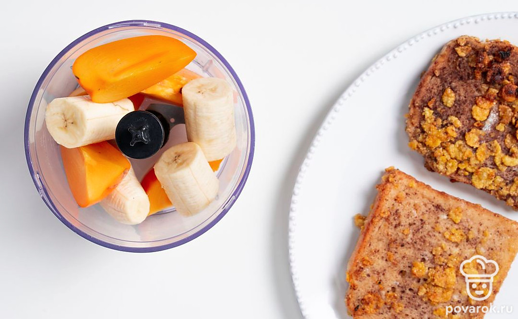 Тост с фруктовым пюре — отличное лакомство. Фрукты и овощи измельчают с давних пор. Слово «пюре», появившееся в русском языке приблизительно в середине XIX века, образовали от старофранцузского слова «purer», которое означает «очищать». Пюре из бананов и хурмы — витаминное наслаждение для любителей сладкого и отличное дополнение к французским тостам. Бананы поднимают настроение и улучшают работоспособность, а хурма способствует пищеварению, помогает избежать варикоза, инфаркта и ОРВИ.