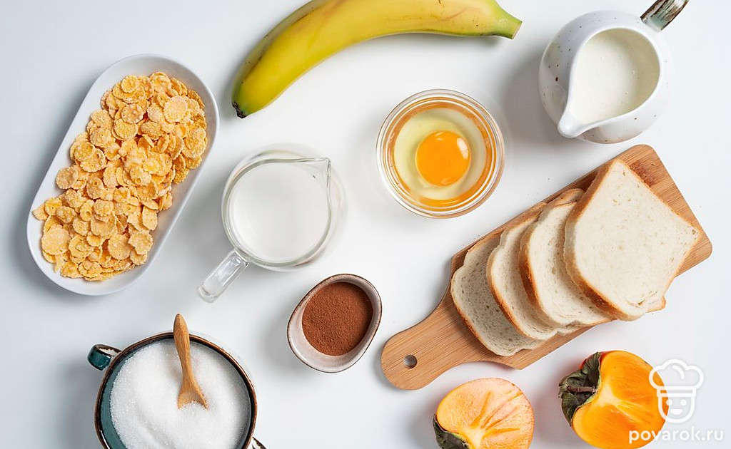 Подготовьте льезон и панировку. Молоко смешайте со сливками, яйцом, корицей и 1 ст. л. сахара. В отдельную емкость раскрошите кукурузные хлопья, засыпьте оставшимся сахаром и перемешайте.