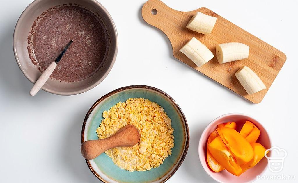 Подготовьте необходимые продукты, удобно расположите их на рабочем столе. Фрукты вымойте, банан очистите, у хурмы вырежьте место крепления плодоножки, извлеките косточки. Хурму и банан нарежьте крупными кусочками. Приготовьте блендер.