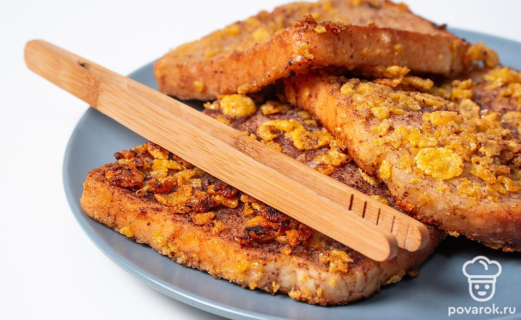Поджарьте тосты. Хорошо смажьте сковороду маслом, разогрейте. Обмакните кусочки хлеба в льезон, потом в кукурузную панировку и выложите на сковороду. Обжарьте их по 2-3 минуты с каждой стороны.