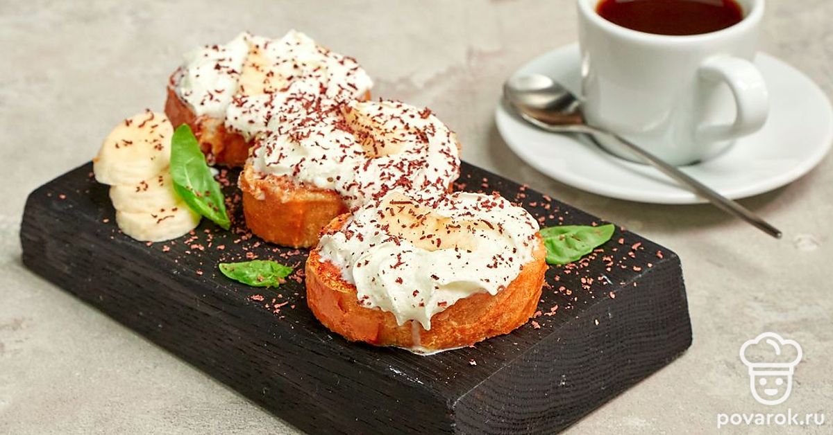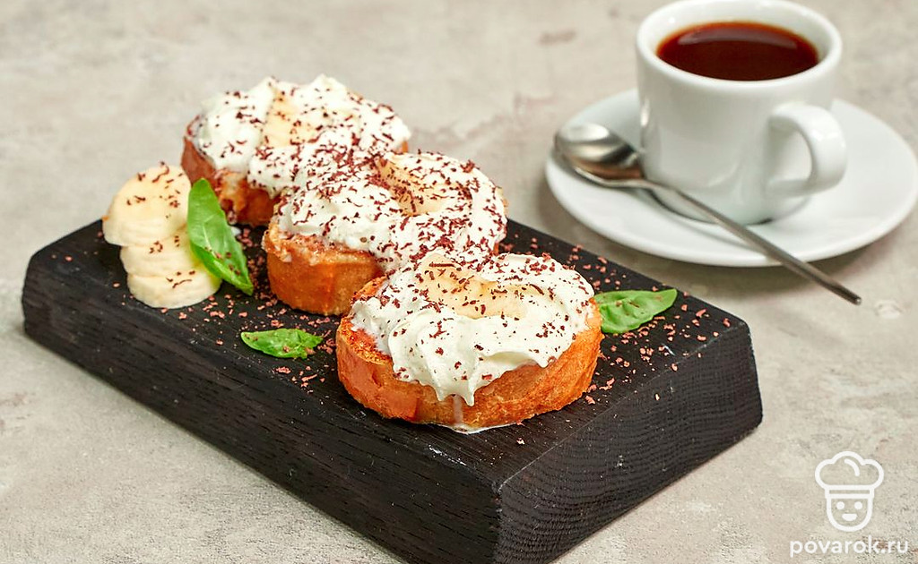 Из хрустящего французского багета можно приготовить не только вкусные и разнообразные бутерброды, но и десерты. Например, багет со взбитыми сливками. Ломтики нежного хлеба сначала обжаривают в яично-сливочной смеси, затем покрывают взбитыми сливками, украшают бананами, шоколадом и карамельным топингом. Просто, вкусно, красиво и доступно.