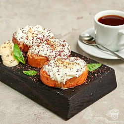 Подавайте тосты из багета со взбитыми сливками в теплом виде. Полейте сверху карамельным топингом.