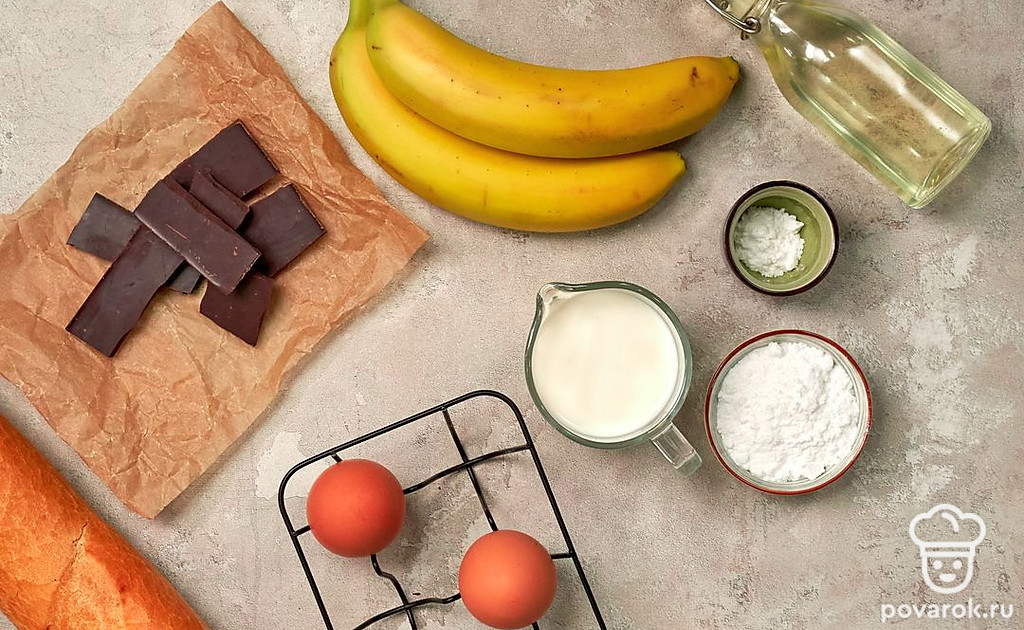 Подготовьте продукты для багета со взбитыми сливками. Банан почистите, нарежьте кружочками. Шоколад натрите на мелкой терке. Багет нарежьте на ломтики толщиной 2,5 см. Поставьте стеклянную миску для взбивания сливок в холодильник на 30 минут. Совет: Ванильный экстракт можно заменить на ванилин или ванильный сахар.
