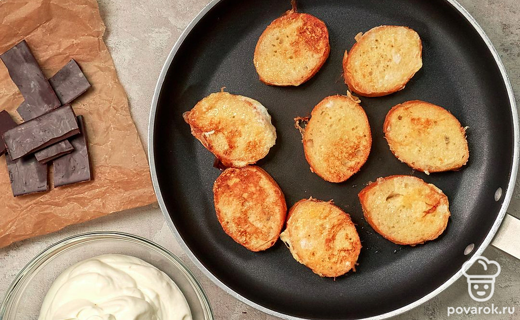 Приготовьте багет со взбитыми сливками. Взбейте яйца, сливки, сахар и ванильный экстракт. В это время нагрейте сковороду с растительным маслом на среднем огне. Ломтики багета обмакните с двух сторон в яично-сливочную смесь. Обжарьте 1-2 минуты с каждой стороны. Немного остудите тосты. Выложите сверху взбитые сливки, затем банан, посыпку из шоколада.