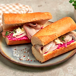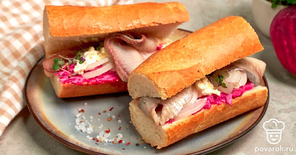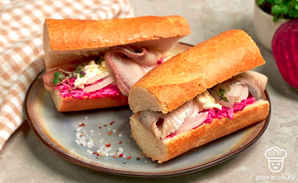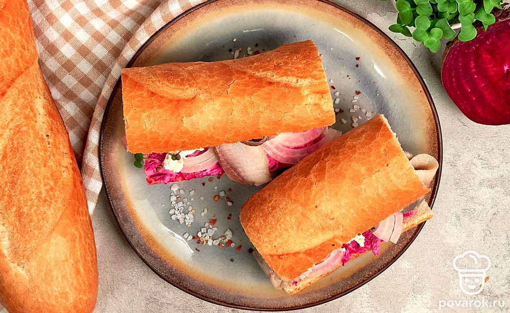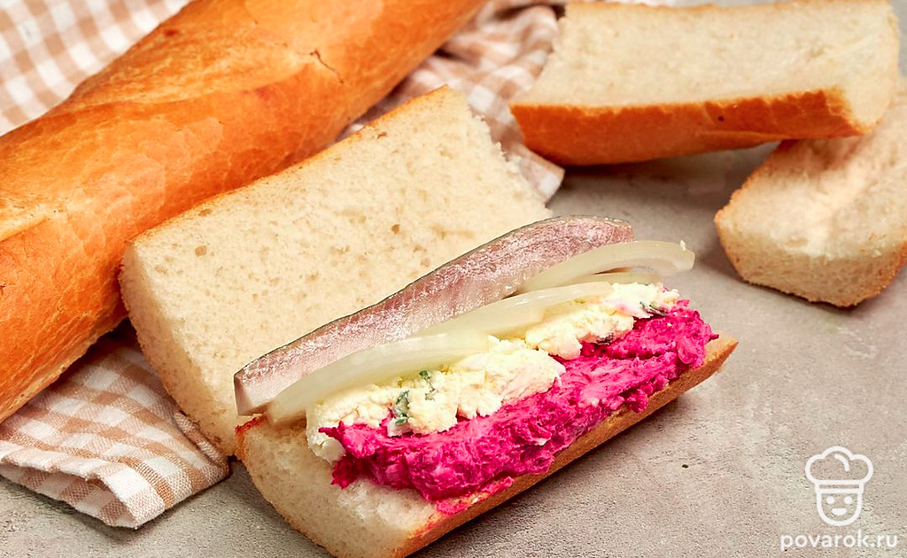 Сельдь под шубой — беспроигрышный вариант праздничной закуски. А если приготовить салат в багете, то угощение станет вдвойне вкуснее и оригинальнее. Багет с филе сельди и овощами готовится очень просто без запекания в духовке. Для приготовления возьмите длинный и узкий багет.