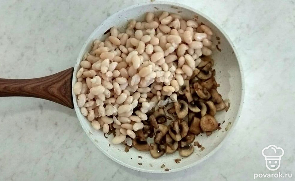 Когда лук станет прозрачным, добавьте грибы и обжаривайте на среднем огне примерно 3-5 минут, постоянно помешивая. Предварительно отварите фасоль. В сковороду с обжаренными ингредиентами добавьте фасоль.