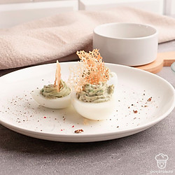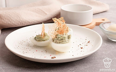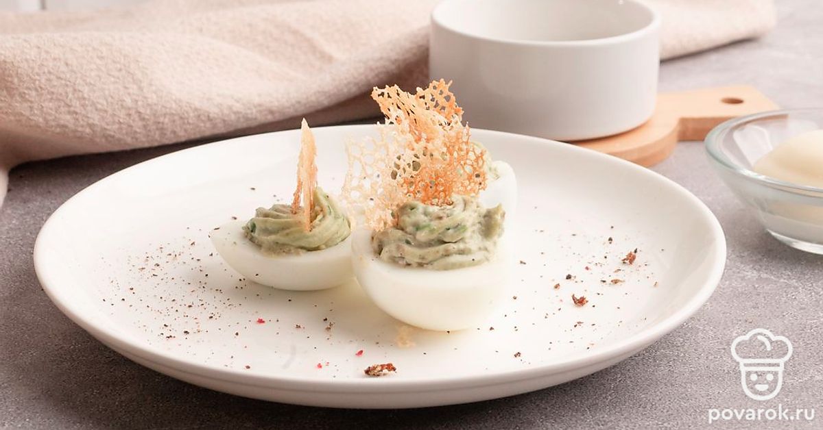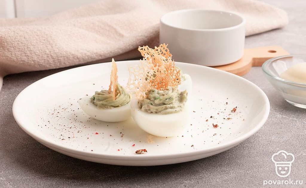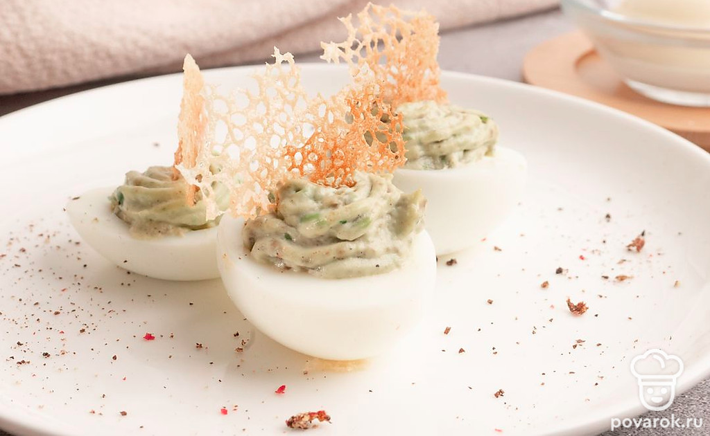 Переложите приготовленную смесь в яичные половинки. И красиво украсьте их приготовленной ажурной сетью.