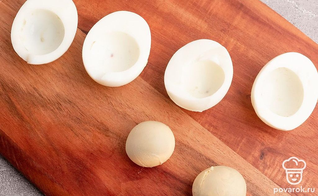 Яйца остудите и очистите. Разрежьте пополам и извлеките желток.