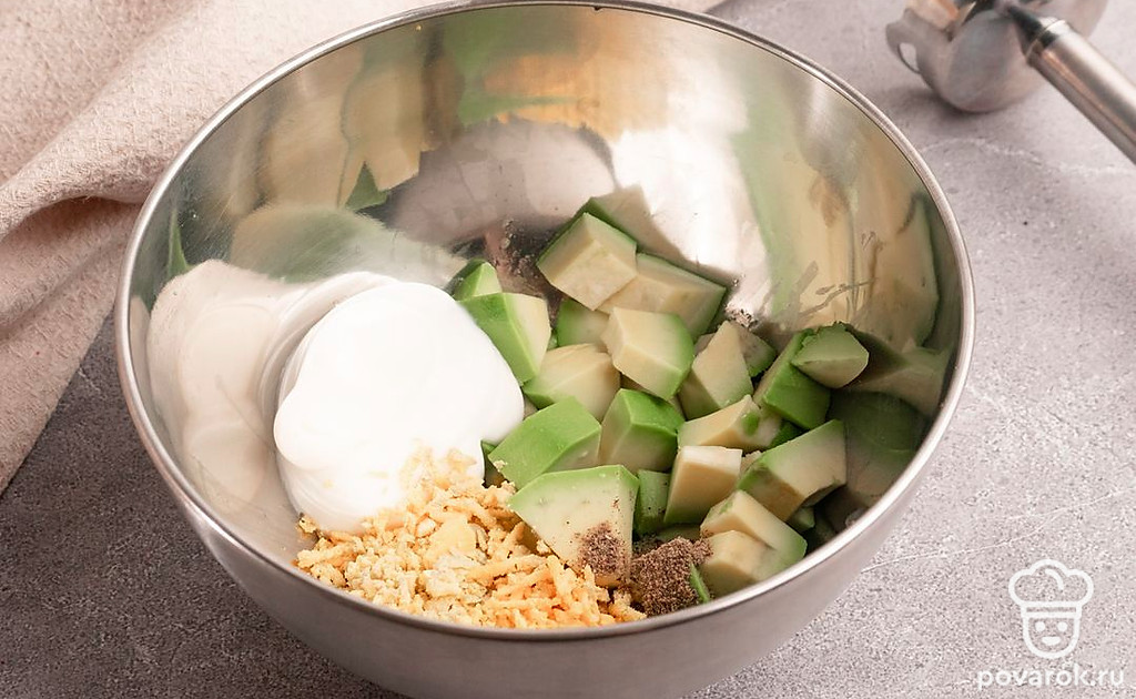 С авокадо удалите кожуру и порежьте мякоть на мелкие части. Переложите все ингредиенты в отдельную емкость и добавьте майонез. Измельчите блендером. Сбрызните соком лимона и добавьте специи, все тщательно перемешайте.