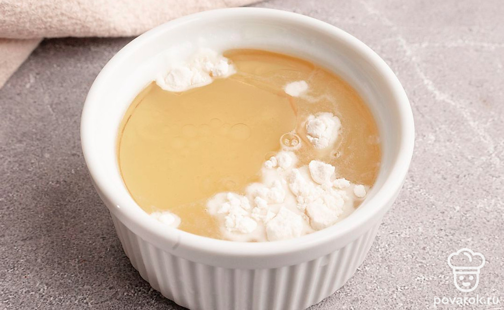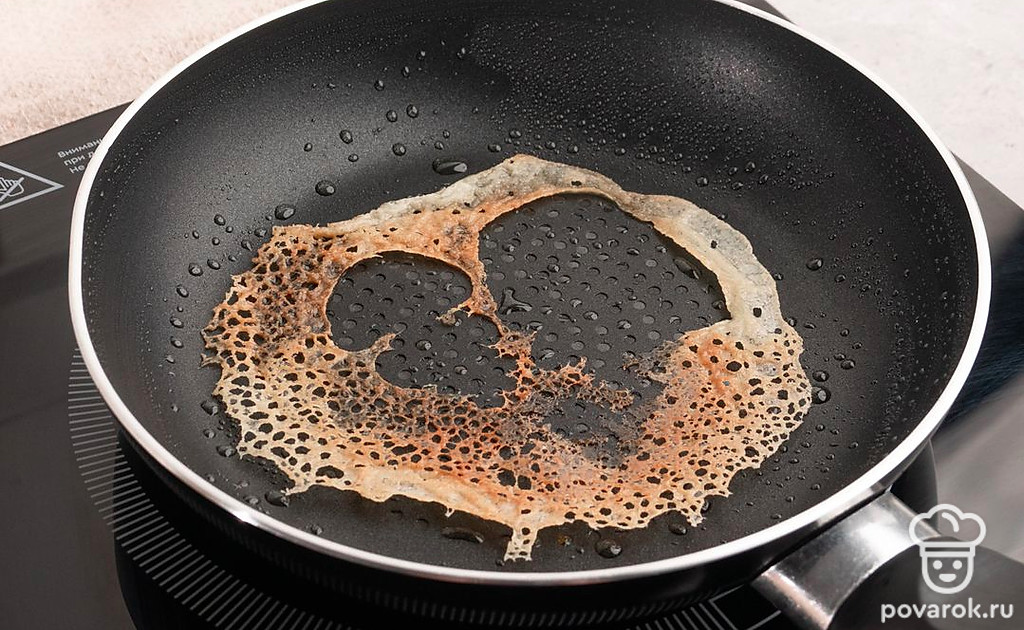 Поставьте сковороду на огонь, немного смажьте сковороду. Тонкой струйкой влейте приготовленное тесто. Получившуюся ажурную сеть разделить на небольшие кусочки.
