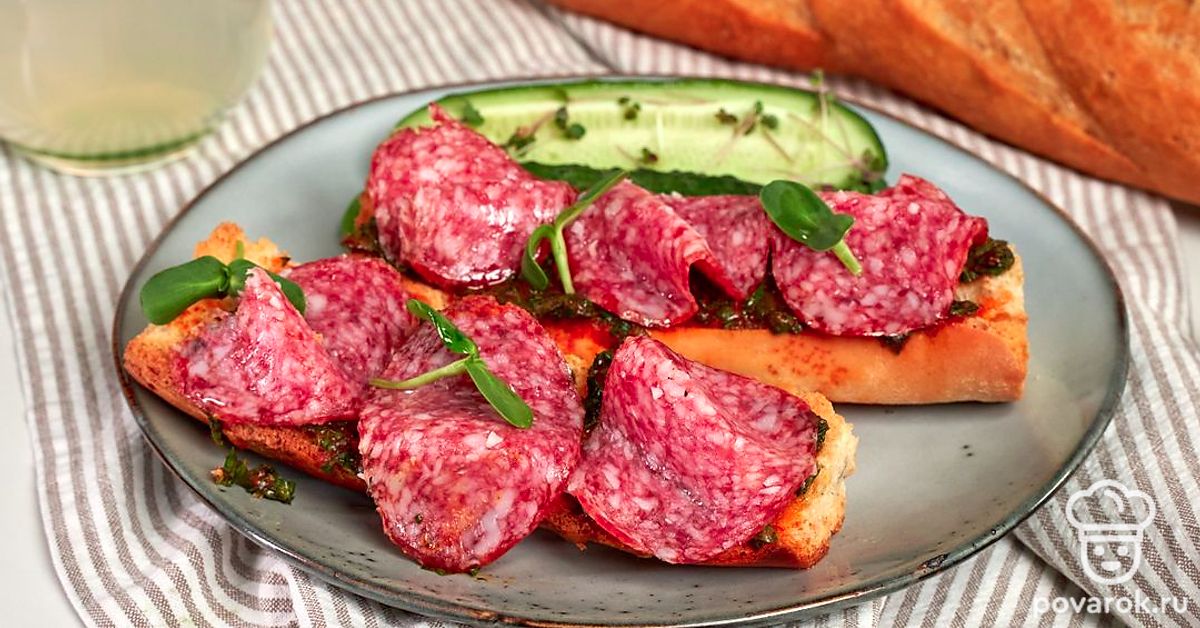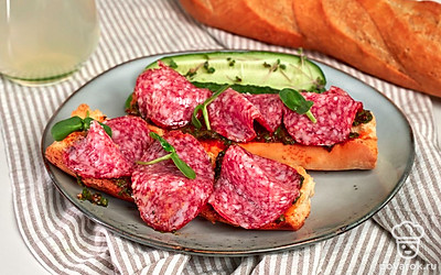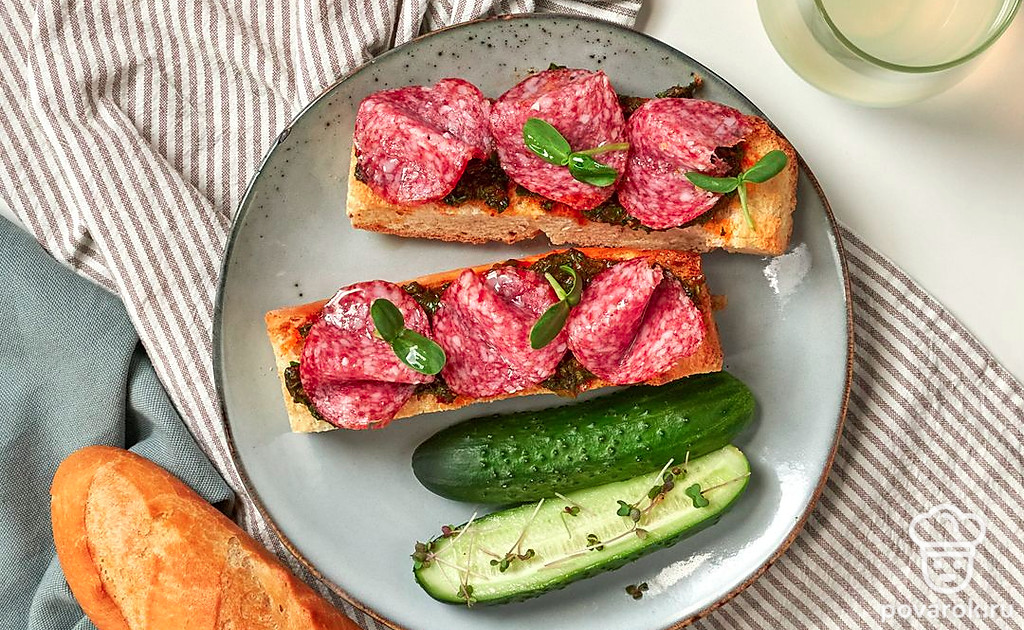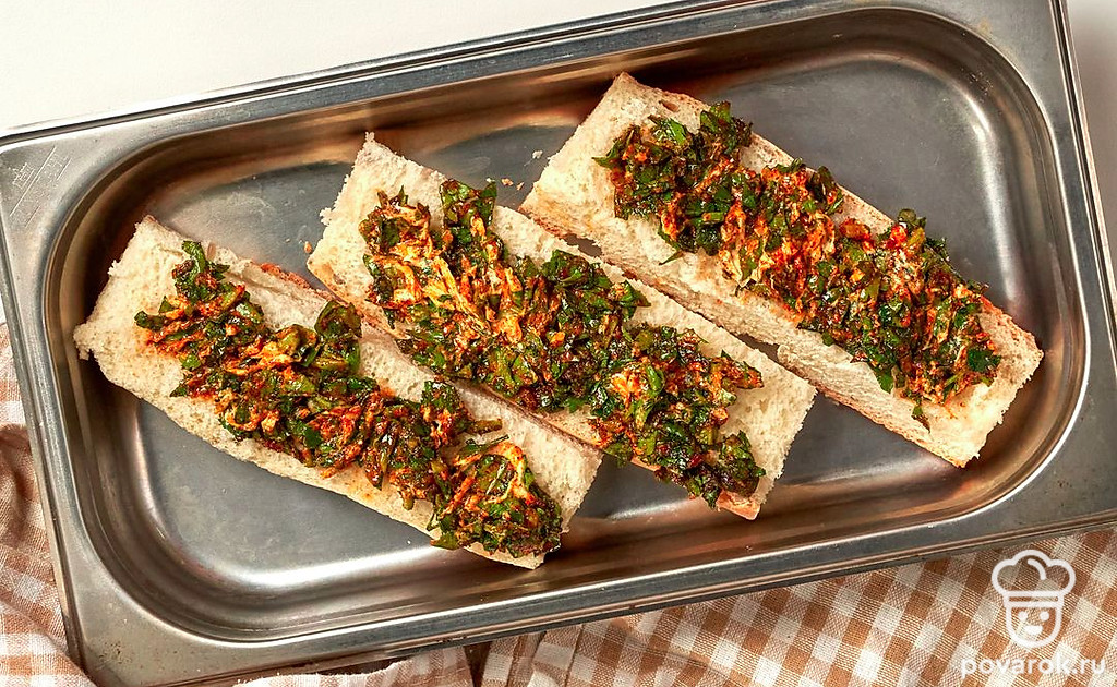 Приготовьте багет с сушеным чесноком. Багет разделите поперек на две части. Затем каждую из частей разрежьте вдоль. Нанесите на мякоть намазку. Выложите на противень. Подсушите в духовке при 180 градусах 10 минут.