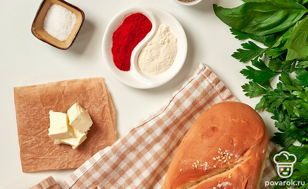 Приготовьте намазку. В тарелке смешайте петрушку и базилик. Добавьте сушеный чеснок, сливочное масло, соль, перец, паприку. Перемешайте.