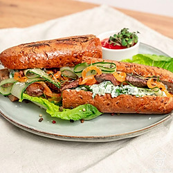Соберите багет. Половинку багета смажьте соусом, положите листья щавеля, затем обжаренные луковые кольца, огуречные слайсы, говядину. Снова смажьте соусом, накройте второй половинкой багета.