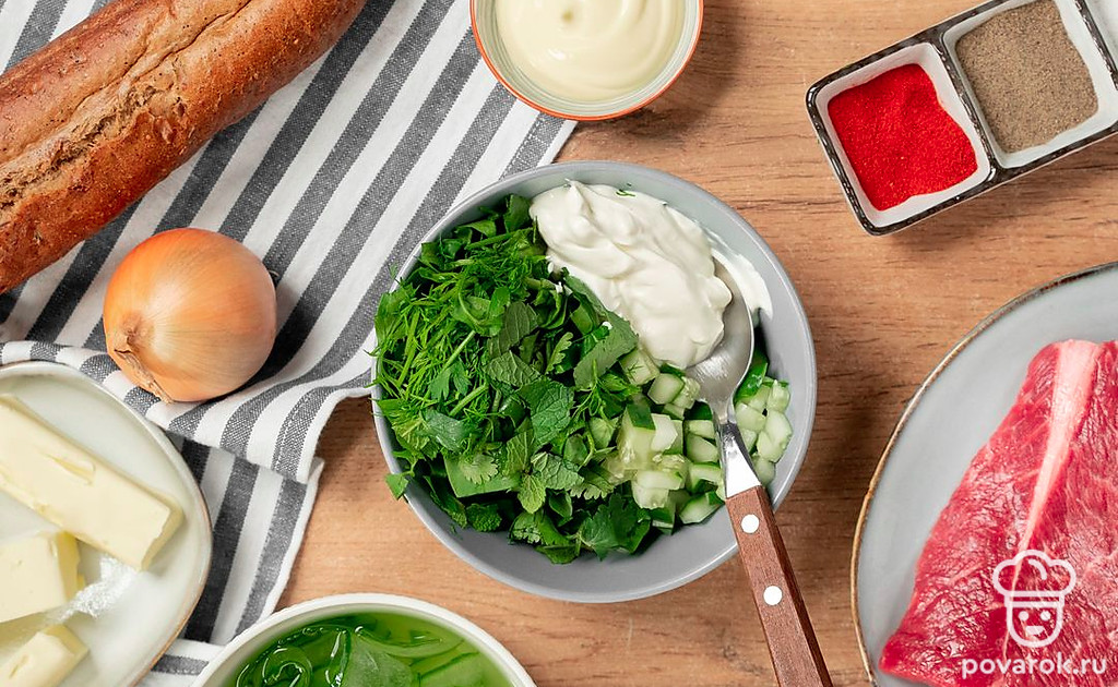 Приготовьте необходимые продукты. Мясо, овощи и зелень вымойте, обсушите на бумажных полотенцах. Часть огурца нарежьте тонкими слайсами при помощи овощечистки. Оставшуюся — кубиками. Зелень мелко нарежьте. Репчатый лук нашинкуйте кольцами. Сливочное масло заранее достаньте из холодильника, оно должно быть комнатной температуры. Репчатый лук очистите.