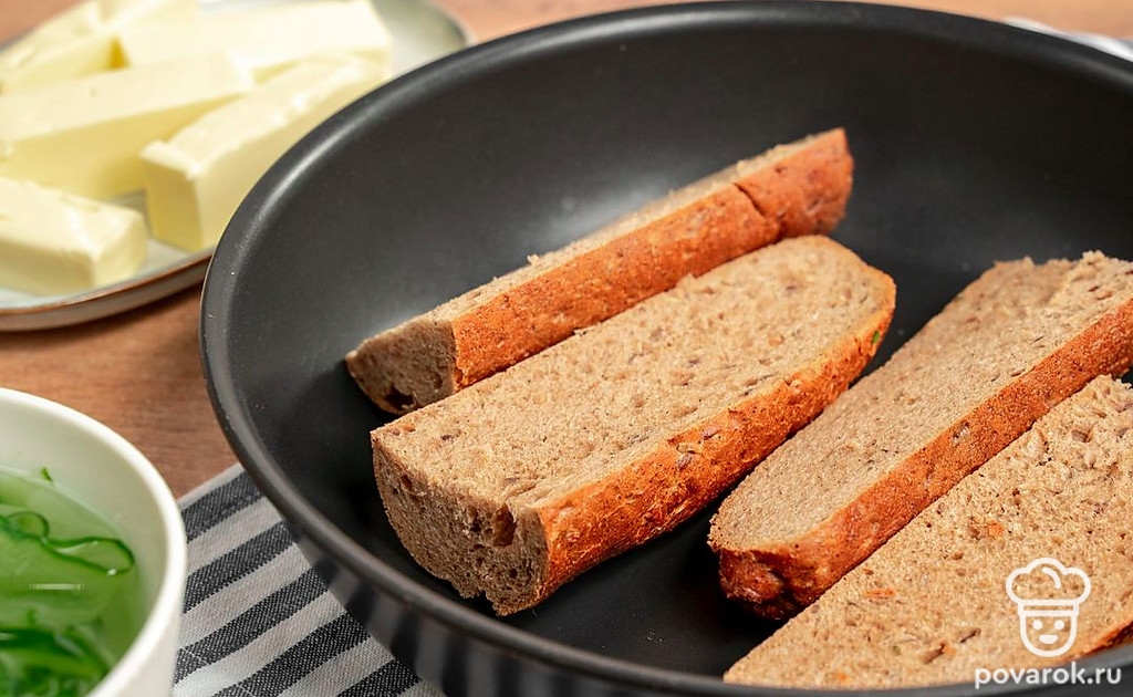 Подготовьте багет. Багет разрежьте поперек. Каждую половину разделите на две продольные части. Обжарьте на сковороде с маслом около 2-3 минут, дайте остыть.