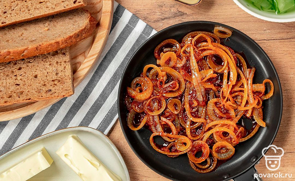 Подготовьте лук. Репчатый лук обжарьте в течение 3-4 минут на сковороде с маслом, паприкой и сахаром.
