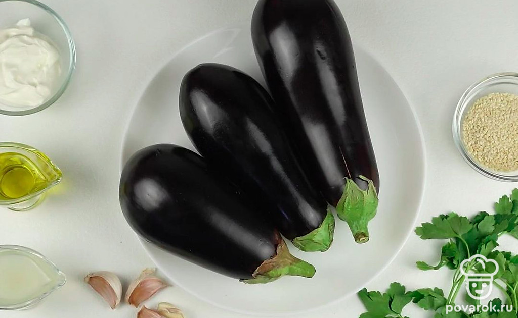 Помойте баклажаны и петрушку. Очистите чеснок. Подготовьте остальные ингредиенты. Разогрейте духовку до 200 °С.
