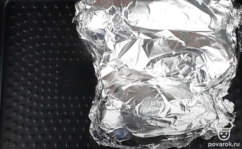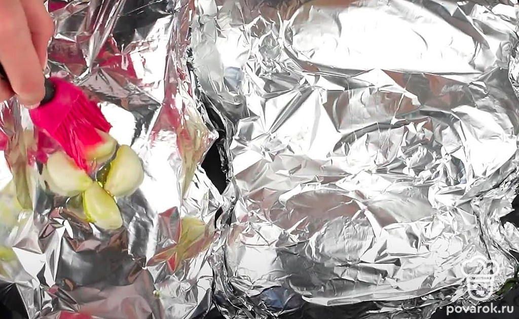 Рядом в фольгу положите зубчики чеснока, также смажьте их оливковым маслом. Заверните чеснок в фольгу. Отправьте противень в духовку на 40-50 минут при 200 °С.