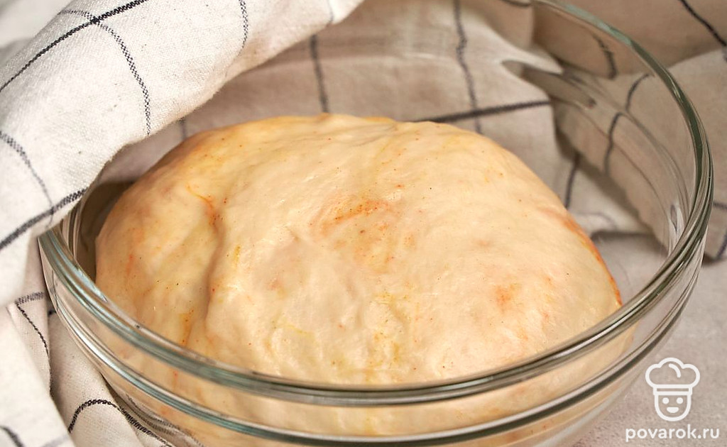 Займитесь подготовкой теста. В теплую воду всыпьте дрожжи и сахар, размешайте. Дайте дрожжам активироваться в течение четверти часа. Затем влейте масло, добавьте соль, перемешайте. Добавьте муку, паприку, куркуму, чеснок. Тщательно перемешайте компоненты. Прикройте полотенцем и отправьте для подъема в теплое место на 1 час. По истечении указанного времени подошедшее тесто обомните, вымешивайте в течение 15 минут. Затем снова оставьте на час в теплом месте.