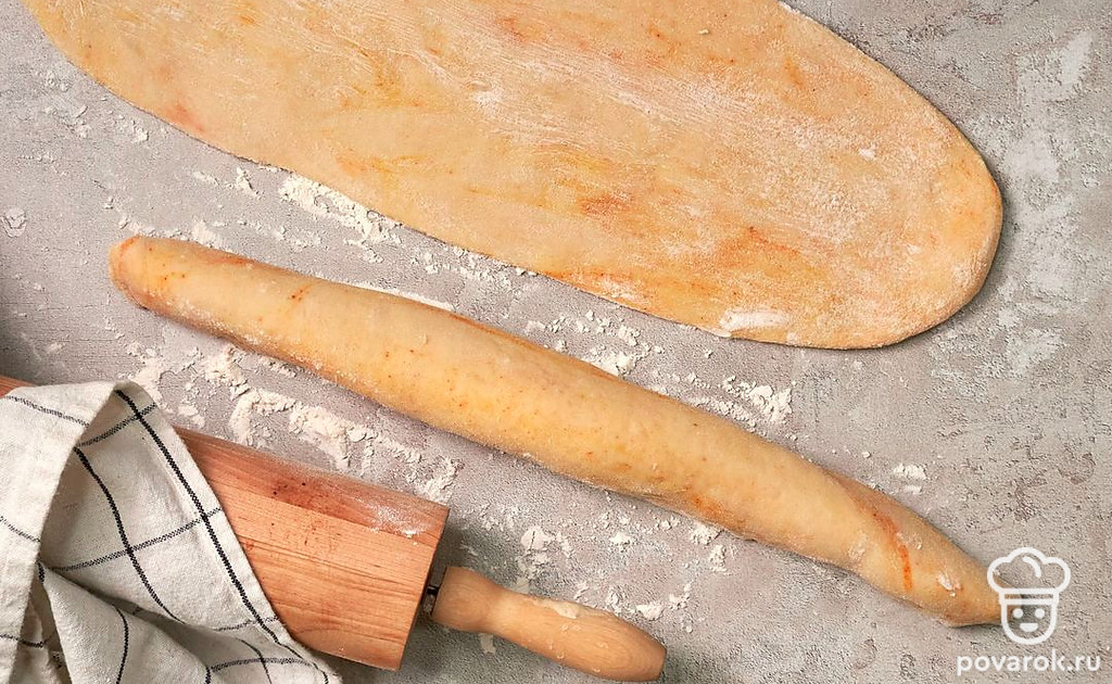 Разделайте тесто. Выложите тесто на рабочую поверхность, предварительно посыпанную небольшим количеством муки. Немного обомните, поделите пополам. Раскатайте в пласты прямоугольной формы. Сверните плотным рулетом, защипните швы. Переложите заготовки на противень.