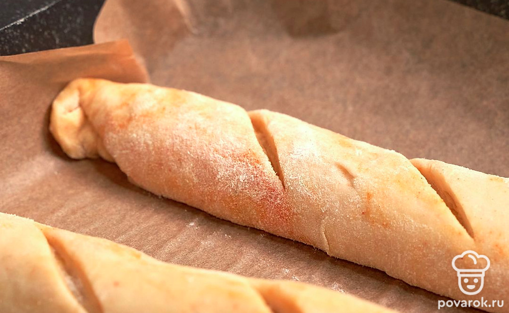 Испеките багеты. Ножом, смазанным маслом, сделайте косые надрезы шириной 3-5 см. Изделие до конца не разрезайте. Каждый отрезок разверните поочередно в разные стороны. Прикройте заготовки полотенцем и поставьте в теплое место на 30 минут. Через полчаса отправьте багеты в духовку, разогретую до 180 градусов, на 10-15 минут.