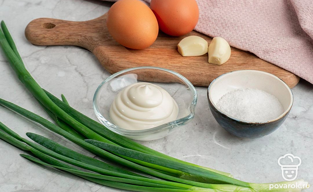Подготовьте все ингредиенты. Заранее отварите яйца, очистите чеснок и промойте зеленый лук.