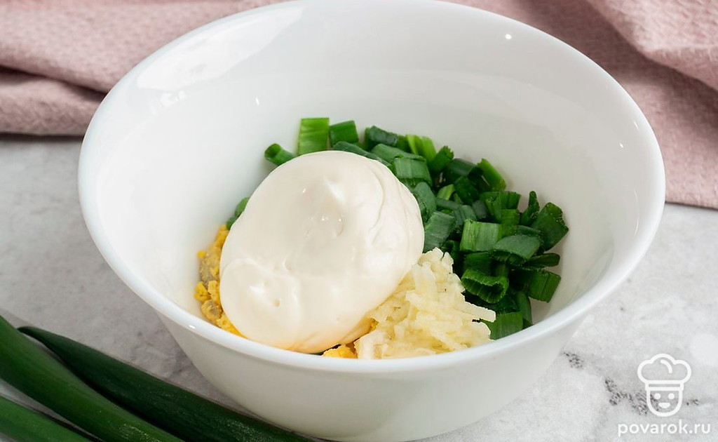 Вареные яйца очистите от скорлупы, разрежьте пополам и извлеките желтки. Натрите на мелкой терке желтки и чеснок. В подходящую емкость выложите желтки, чеснок, майонез и измельченный зеленый лук. Посолите на свой вкус и смешайте до однородности.