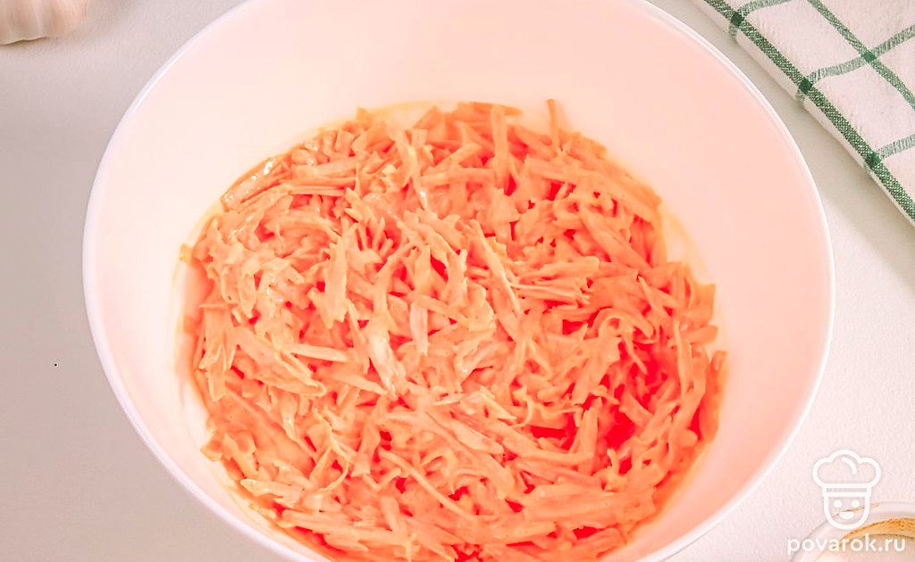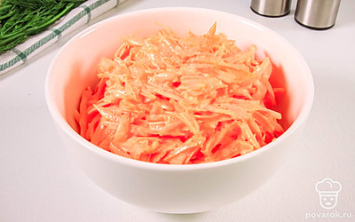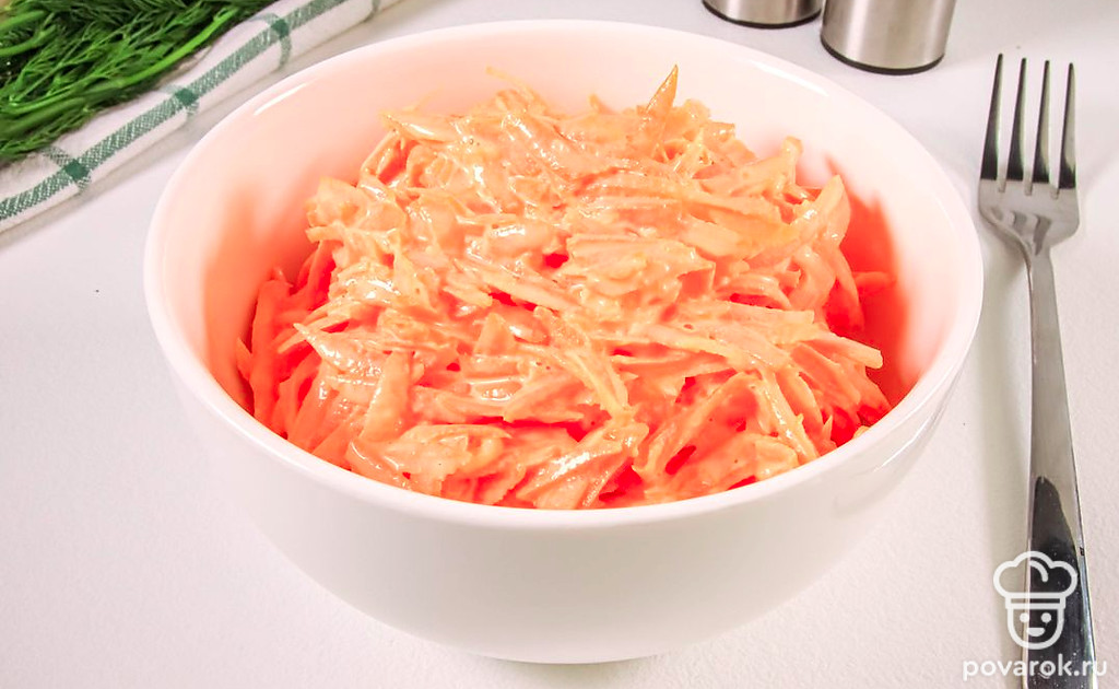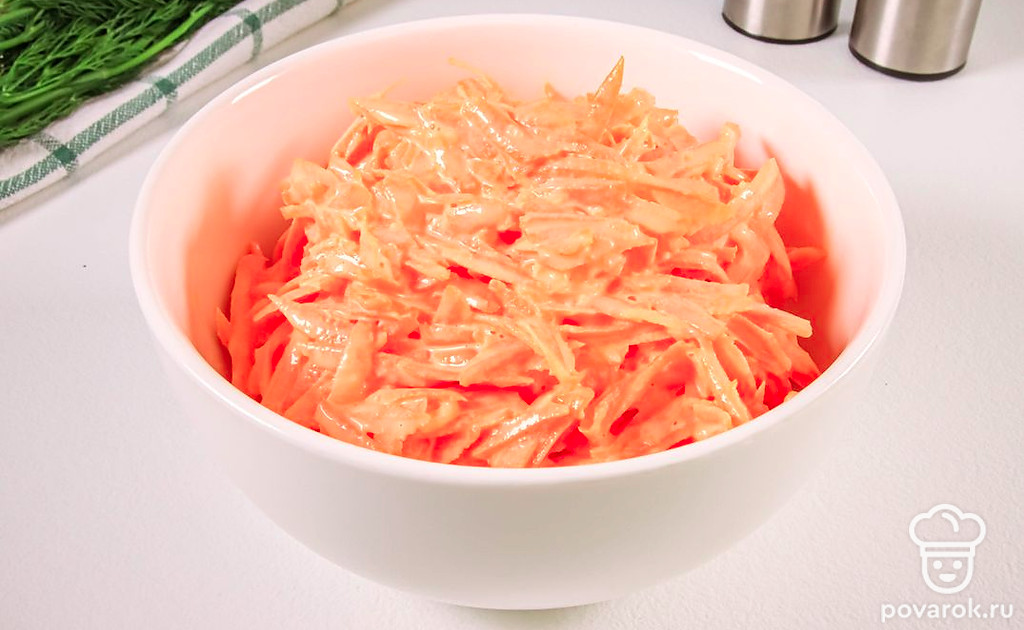 Простой и быстрый в приготовлении салат с пикантным вкусом чеснока. Особенно полезно употреблять в пищу такой салат в холодное время года, так как морковь — главный ингредиент салата — обладает сильным антибактериальным и антисептическим свойством. Если вы хотите получить более диетический вариант салата, используйте в качестве заправки сметану или греческий йогурт.