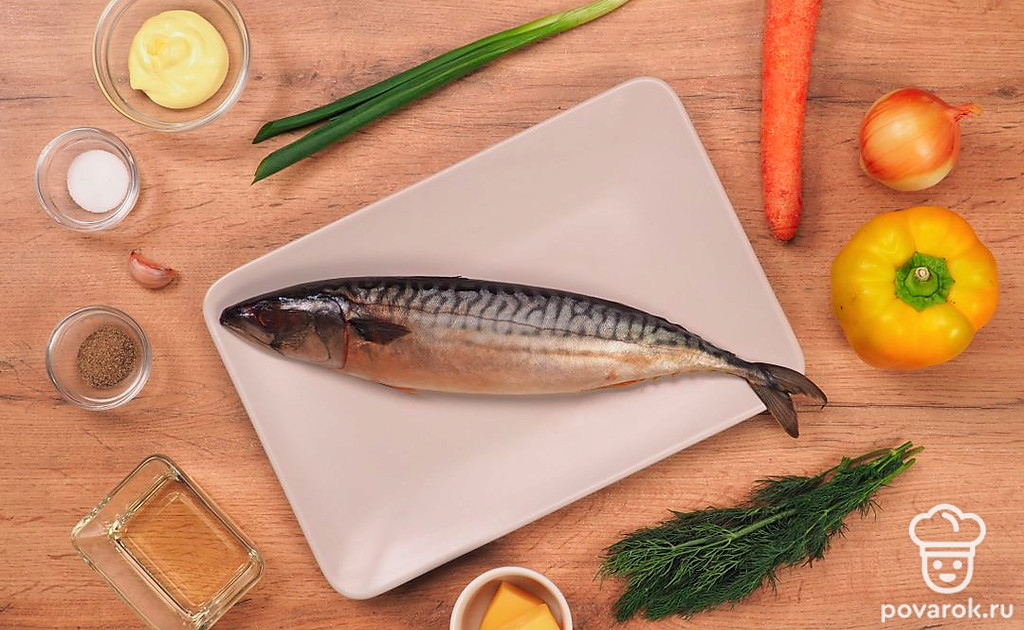 Удобно разложите все продукты. Разморозьте скумбрию заранее. Помойте и очистите от кожуры все овощи. Очистите перец от семян и перегородок. Помойте зелень.