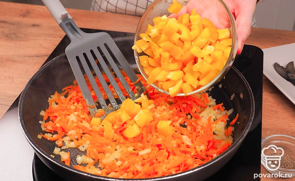Нарежьте овощи. Измельчите на кубики сладкий перец и репчатый лук На терке натрите морковь. Чеснок нарежьте на 4 пластины. Кусочки чеснока обжарьте на сковороде в растительном масле и уберите их. В чесночном масле обжарьте лук и морковь в течение 3-4 минут. Добавьте перец и продолжайте обжаривать еще 2 минуты. Посолите, поперчите по вкусу. Мелко порубите зелень и добавьте к овощам. Уберите сковороду с плиты.