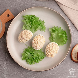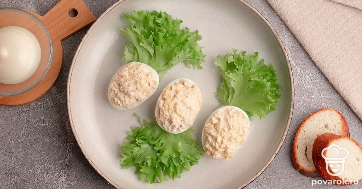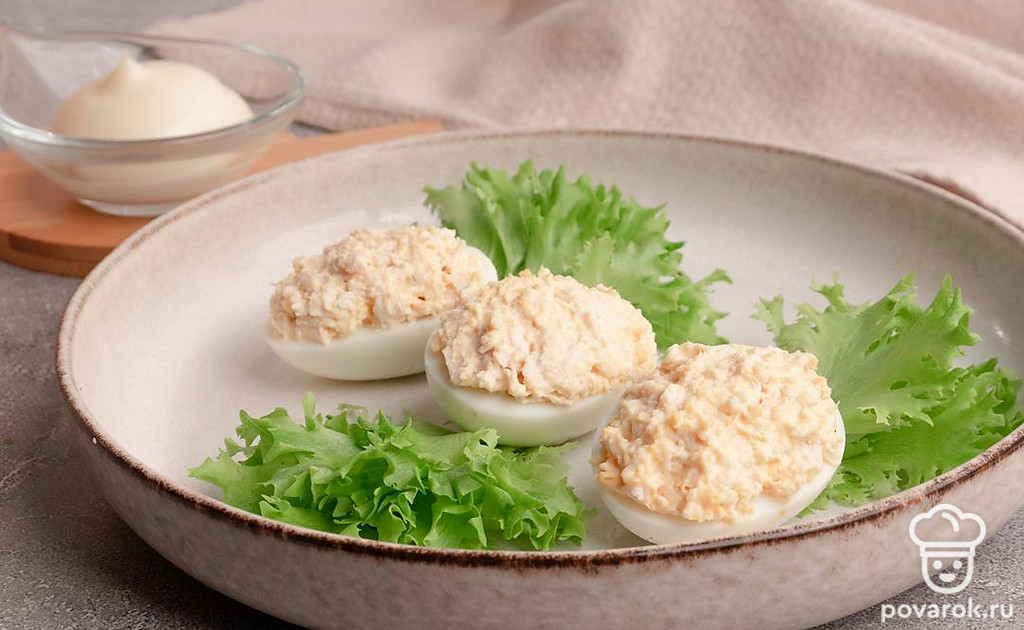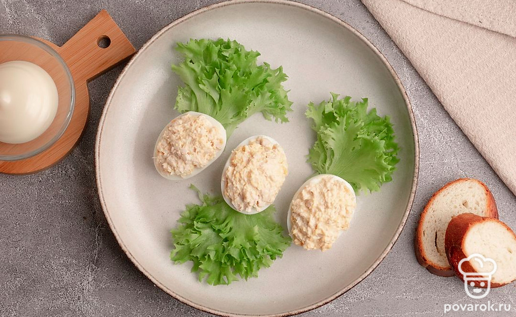 Наполните получившейся начинкой половинки яичных белков. Выложите закуску на листья свежего салата.