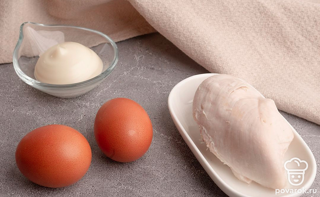 Отварите филе куриной грудки в подсоленной воде до готовности в течение 15-20 минут, а затем остудите. Куриные яйца отварите вкрутую и очистите.