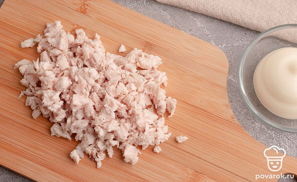 Для приготовления 4 порций фаршированных яиц нам понадобится половинка отварного куриного филе, примерно 80 г. Нарежьте курицу мелкими кубиками.