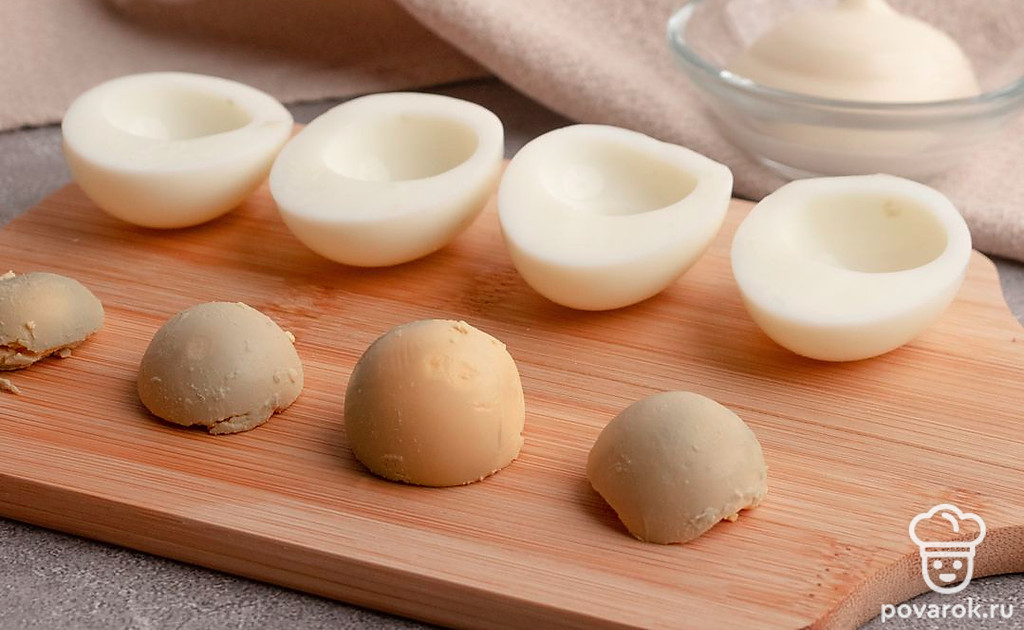 Совет: Чтобы половинки яиц были более устойчивыми, срежьте немного их основания.