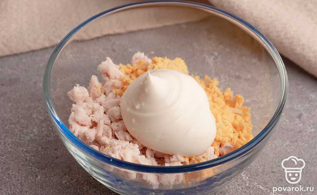 В миску выложите мелко нарезанное куриное филе и измельченные желтки. Добавьте майонез, все перемешайте.