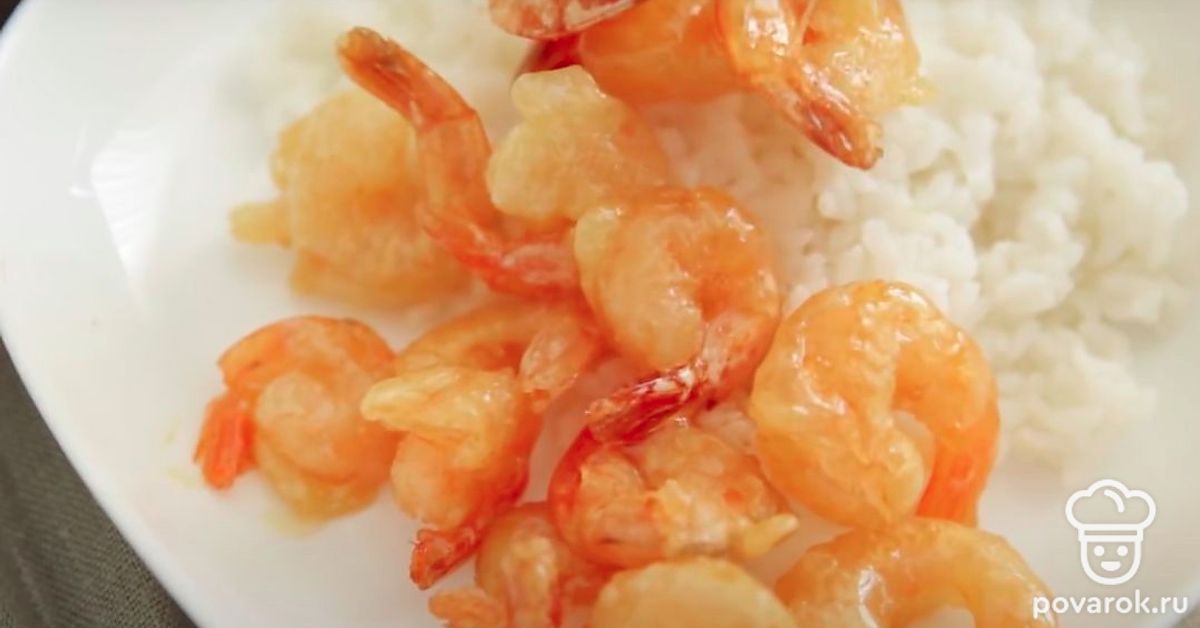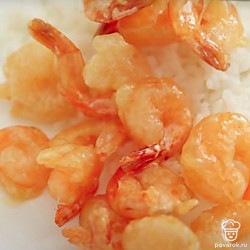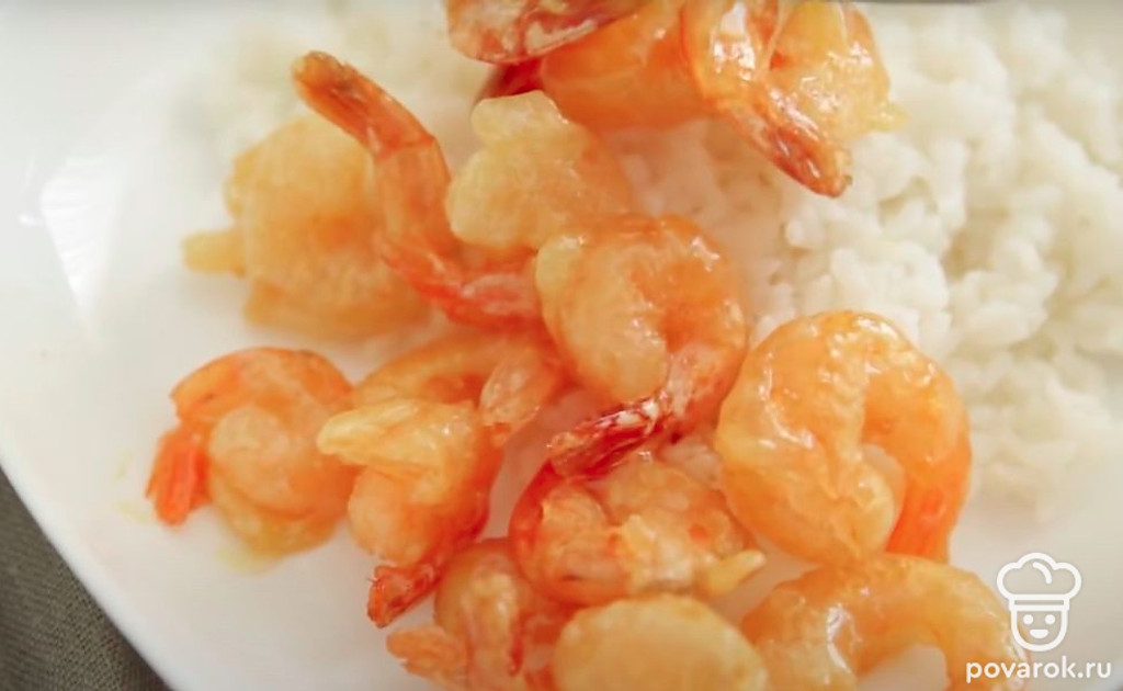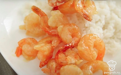 Когда все креветки будут обжарены, опустите их в мед и перемешайте. Подавайте креветки, выложив их на рис и посыпав кунжутом.
